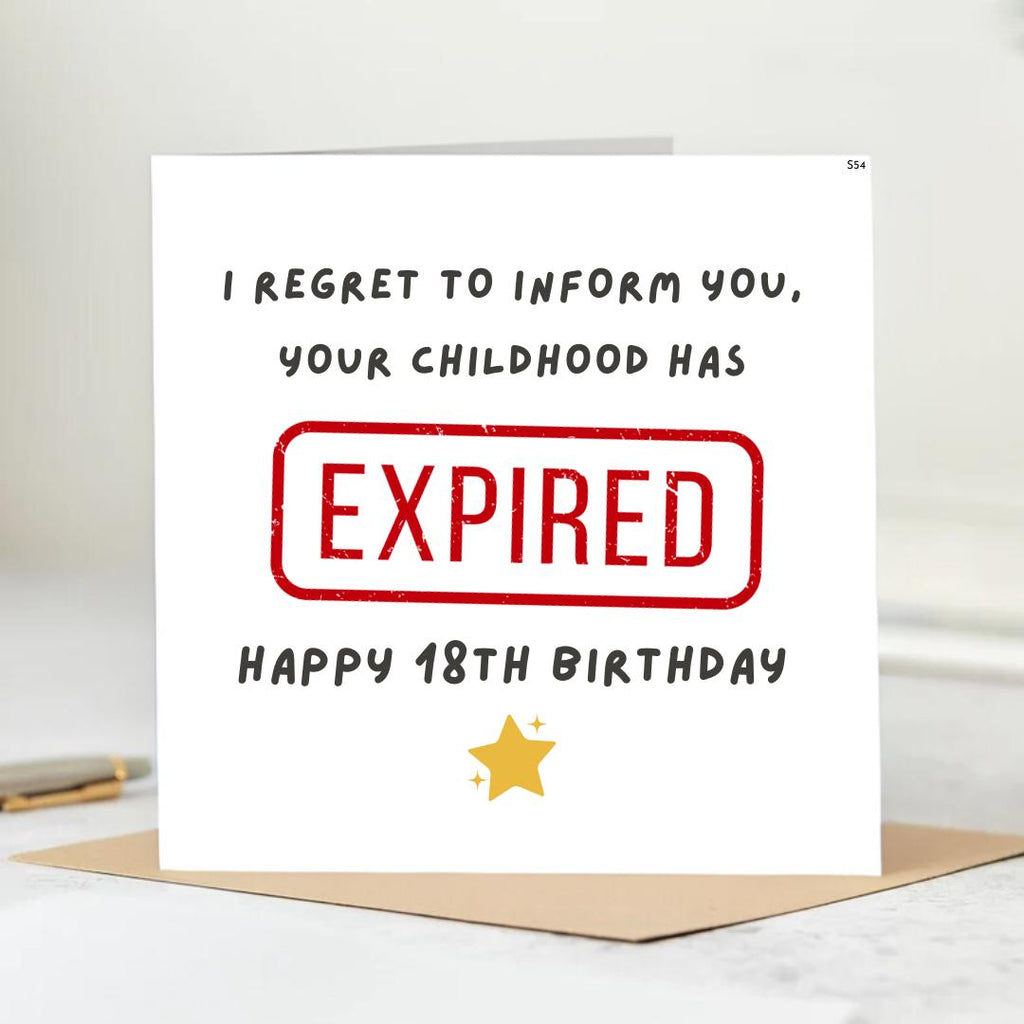 Funny 18th Birthday Card , Childhood Expired – Humorous Coming of Age Card, Funny Milestone Birthday Greeting.
