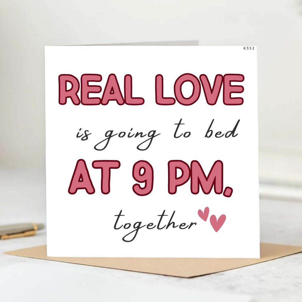 Funny Anniversary Card | Real Love Is Going To Bed At 9PM | Happy Wedding | Husband Wife Boyfriend Girlfriend Fiance | Gift For Him Her 6x6